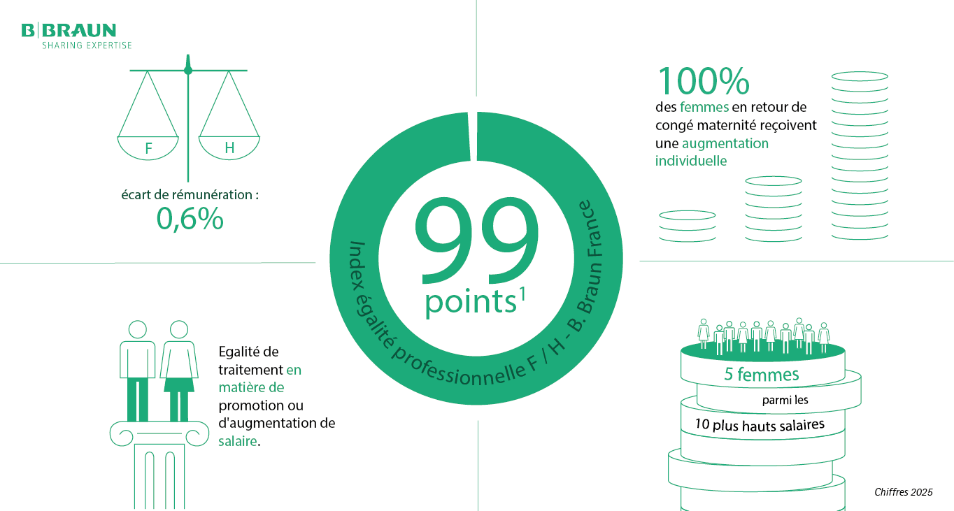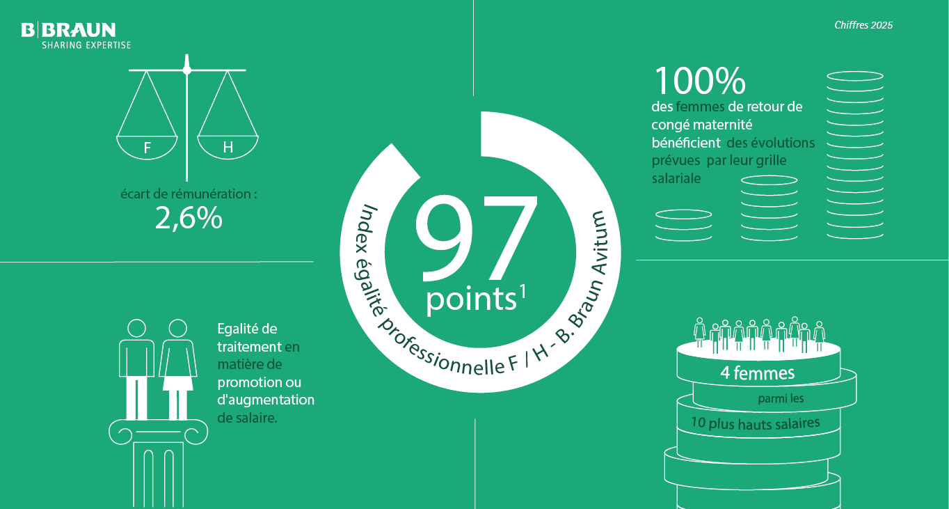 B. Braun s’engage depuis de nombreuses années sur l’équilibre entre la vie professionnelle et la vie personnelle de chaque collaborateur, sur l’égalité de traitement entre les femmes et les hommes, en matière de recrutement, de formation, de rémunération, de promotion, mais également sur l’égalité de chance, la lutte contre les stéréotypes et sur le respect de la différence.