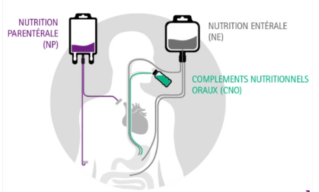 L'apport nutritionnel peut être administré par voie orale (compléments nutritionnels oraux) ou par l'intermédiaire d'une sonde gastrique (nutrition entérale) ou, lorsque le tube digestif n’est pas fonctionnel, par voie veineuse (nutrition parentérale).